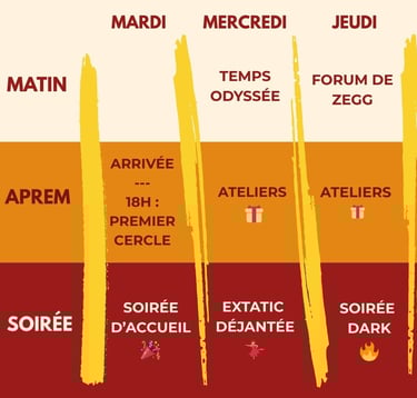 Entre les mains d'une équipe qui montre ses doutes et sa vulnérabilité, transmet sa joie pour la vie et l'amour, et met un point d'honneur à ne laisser personne pour compte, l'Odyssée est le lieu idéale pour créer du lien et explorer ensemble les coins de nos âmes qui nous effraient le plus.”